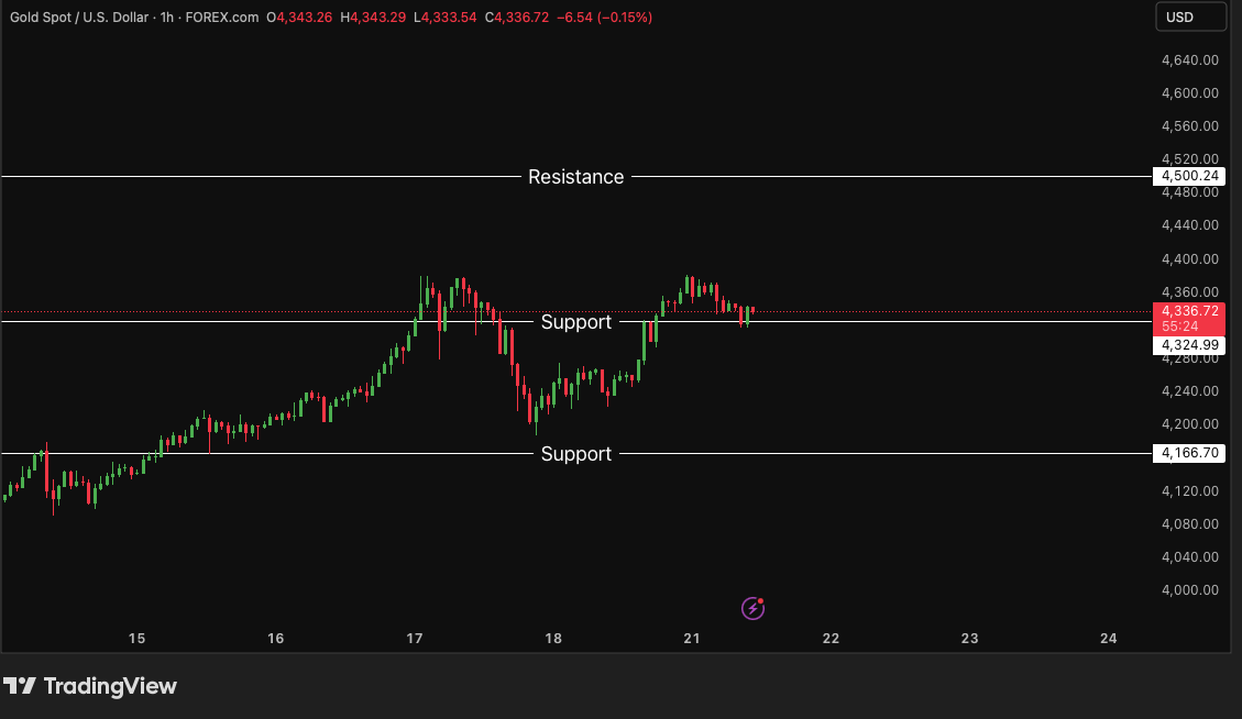 Gold rose to test recent highs near $4,380 before pulling back. Immediate support sits at $4,324, while a sustained hold could allow a move toward $4,500. Technical structure signals caution if support breaks.