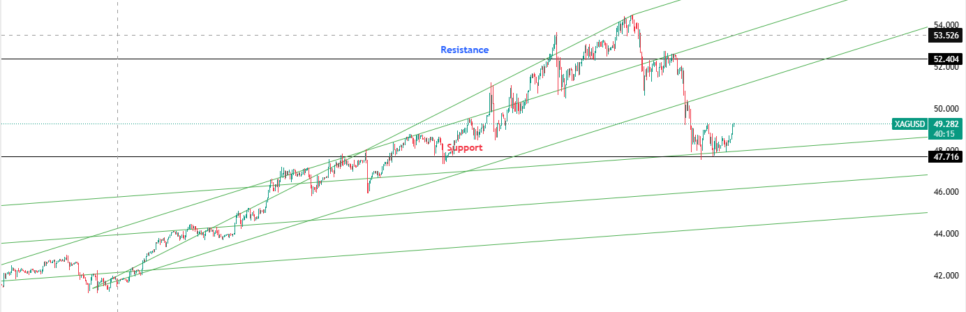 Silver fell below the $50 mark following Tuesday’s sharp sell-off but maintains a bullish technical structure within its pitchfork channel. Despite volatility, industrial and monetary demand keep the broader uptrend intact.