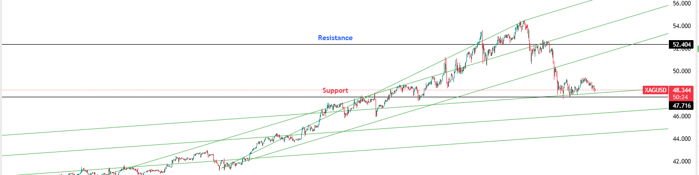 Silver slipped below $50 in Tuesday’s sell-off but continues to hold its long-term bullish pitchfork structure. The metal consolidates amid high volatility, with industrial and monetary demand still acting as dual tailwinds.