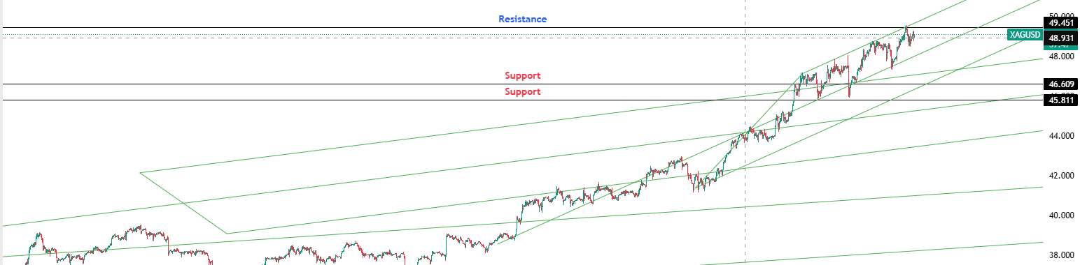 Silver remains in a sideways-up trend above $49, respecting top pitchfork prongs as the shutdown continues.