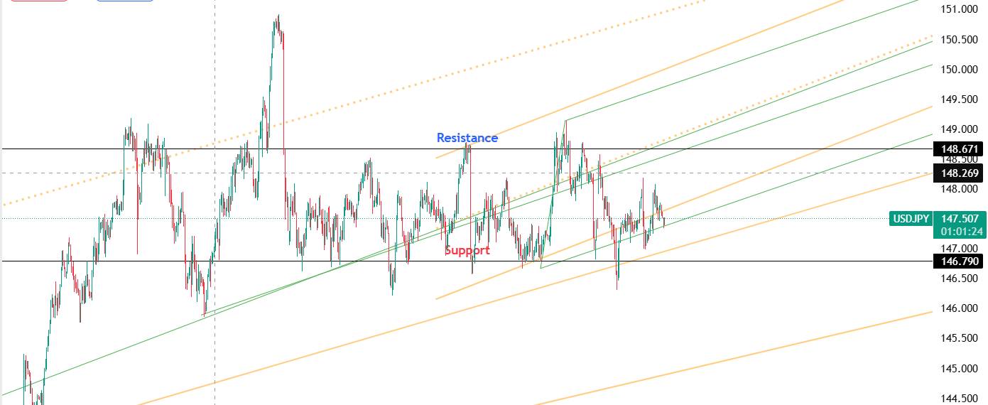 Key Levels: Support at 146.79 | Resistance at 148.67