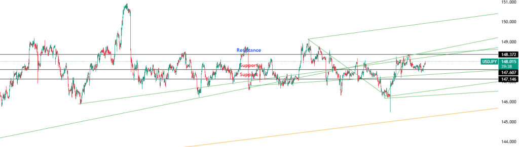 Key Levels: Support at 147.61 | Resistance at 148.37