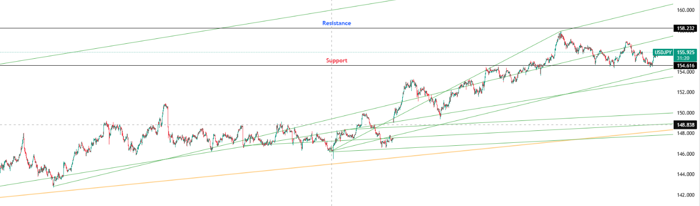 Key Levels: Support at 154.616 | Resistance at 158.232